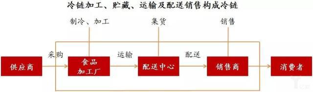 冷链物流是指为保持食品(新鲜或冷冻)的品质或其他产品(医药等)的效能以及减少运输损耗,在其加工、贮藏、运输、分销、零售等环节,货物始终保持一定温度的一种物流运输方式,由预冷处理、冷链加工、冷链储存、冷链运输和配送及冷链销售几方面构成,涉及冷库、冷藏车、保温盒、冷藏陈列柜等设施。