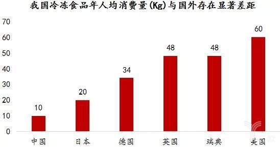 另外,我国冷冻食品年人均消费量仅为10kg,低于日本的20kg,远远低于美国的60kg。这是由于中国居民对于冷冻食品依赖性较弱以及冷链食品供给端尚未产业化、规模化所致。