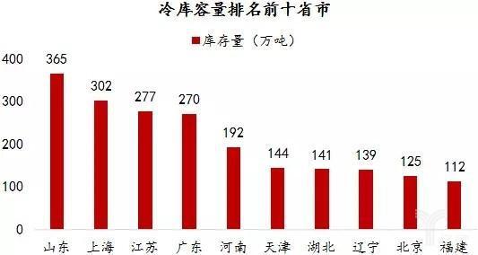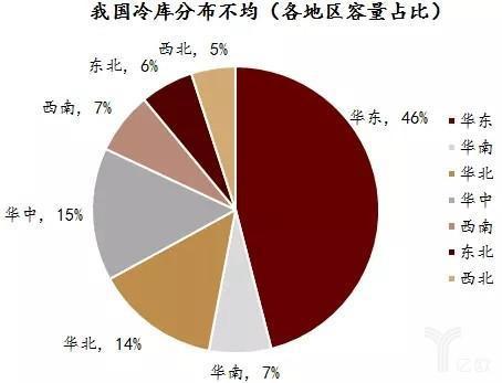 由于我国经济发展的地域性特点,我国冷库分布不均匀,华东地区冷库容量已占到全国冷库总容量近46%,其中山东、上海、江苏发展速度较快,冷库容量居前列;而我国果蔬产地的内陆各省市市场冷库容量仍旧偏低,造成冷链物流在生产源头缺乏预冷,产生源头“断链”。